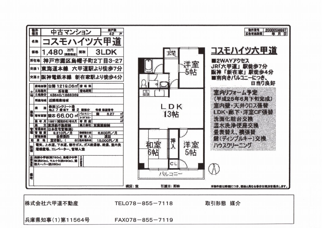 HOME > 終了物件 > 烏帽子町2丁目のコスモハイツ六甲道です!!(成約)